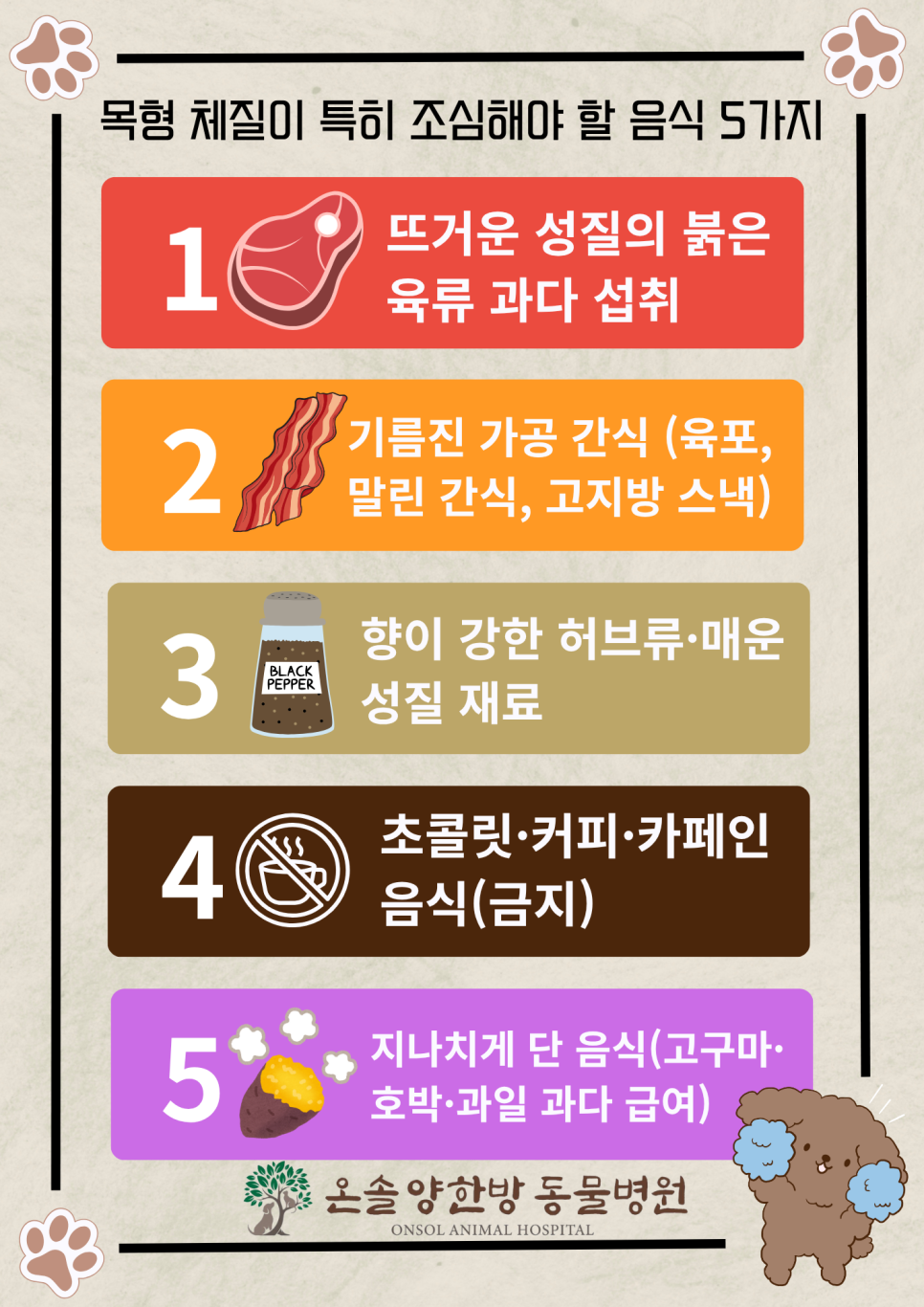 양고기, 소고기 등 뜨거운 성질의 육류는 목형에게 기운을 위로 치밀게 하는 대표 식재료입니다. 이미 열이 많은 목형에게 과량으로 들어가면 피부 발적, 가려움, 활동성 과다, 불안 행동이 강화될 수 있습니다.